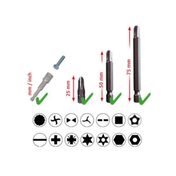 - Preciziškas ir tvarkingas populiariausių 1/4″ galvučių išdėstymas