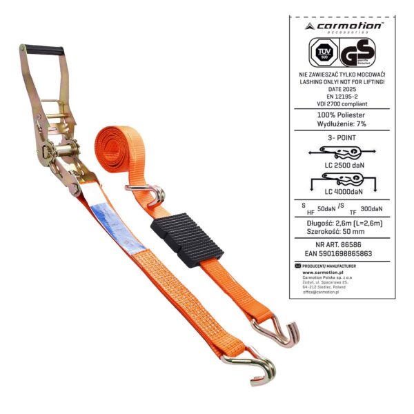 A strong and durable 3-point strap designed to secure vehicle wheels to trailers. It features a durable metal tensioner and strong hooks, ensuring a quick, stable, and secure attachment. The strap is ideal for professional and amateur transport applications.