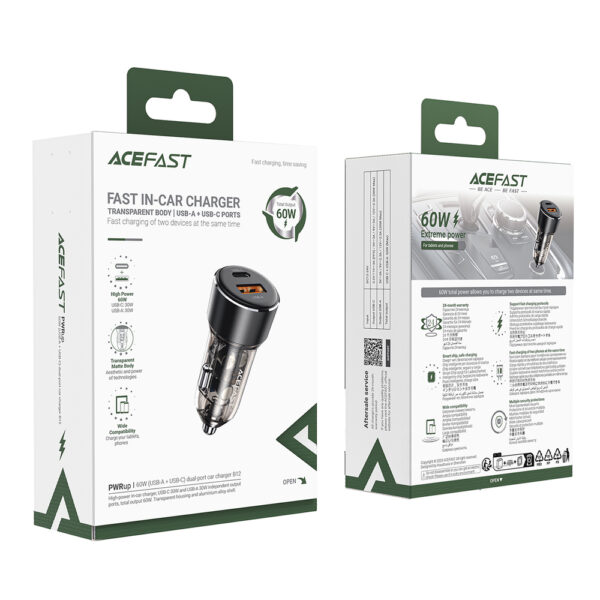 Do you need to quickly charge your smartphone, tablet or other mobile devices in the car? The Acefast B12 charger can charge two devices simultaneously using the USB-A and USB-C ports. Provides power up to 60W, ensuring instant charging. Security and support for a variety of fast charging protocols ensure your devices are protected and ready to go in the blink of an eye. The stylish, translucent design makes the charger not only functional, but also adds a modern look to the interior of your car.