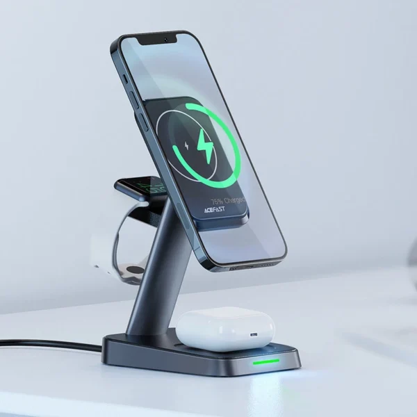 A small station for wireless charging of three devices at the same time – smartphones, headphones and smartwatches. It is compatible with phones that support MagSafe technology , including the iPhone 12 series and above. The Acefast E3 can be conveniently adjusted by placing the phone horizontally or vertically. The magnetic holder allows you to conveniently put the phone down and charge it almost immediately .