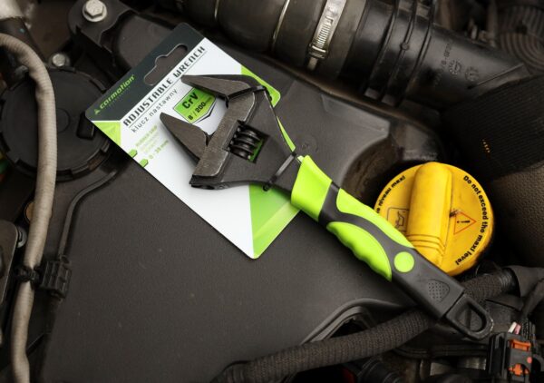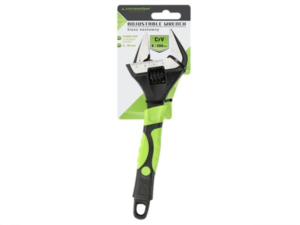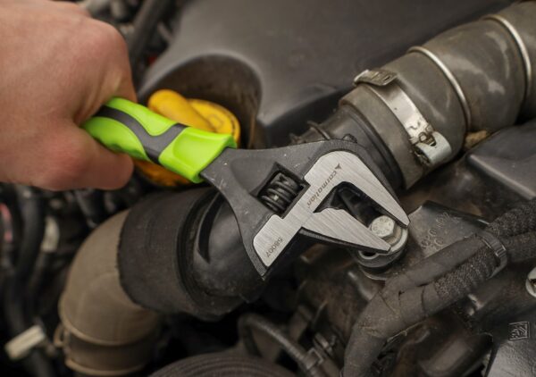 The adjustable wrench is made of chrome vanadium steel with a phosphate coating. It has a rubber handle, a thin head and a wider jaw than traditional adjustable wrenches.
