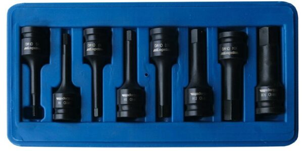 Techniniai duomenys: Pavadinimas: AD-08 Prekės kodas: 3510.11 Rakto koto skersmuo: 1/2″ Galvučių skaičius rinkinyje: 8 vnt. Šešiakampių dydžiai: H5, H6, H7, H8, H10, H12, H14, H16 Medžiaga: Chromo molibdeno plienas (Cr-Mo)
