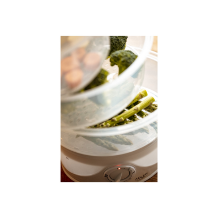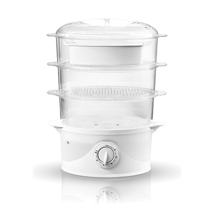 | Specialios funkcijos | Designed for easy cooking different dishes simultaneously; 3 transparent and folding trays; 40 secs. start up; Egg trays; Designed tray for juice extracts; TurboSteam attachment; Bowl for rice cooking; Semi-transparent water container with water level indicator; Cool-touch handles and cover; 60 min. mechanical timer; Power indicator lamp. |