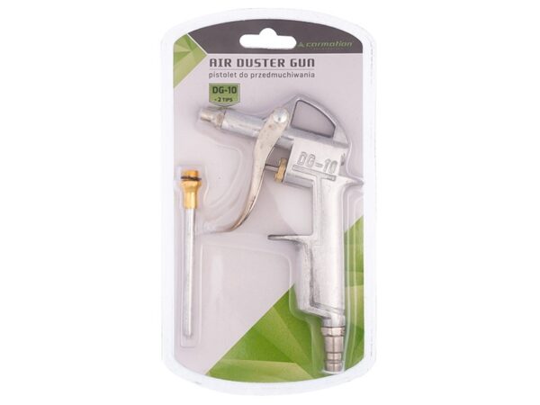 Air blow gun is made of metal and aluminum. Working pressure is in the range of 0 – 10BAR. The gun is equipped with an additional 10cm long tip. Its construction is light, which does not hinder the work. The gun is compatible with standard pneumatic hoses.
