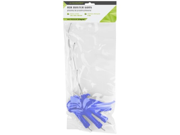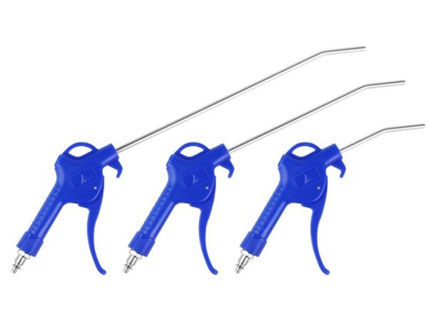 Set of 3 guns with nozzles of different lengths and a standard 6 mm connection. They are used to remove various types of contamination with a stream of compressed air in the car interior and in hard-to-reach areas. Max pressure – 15atm.