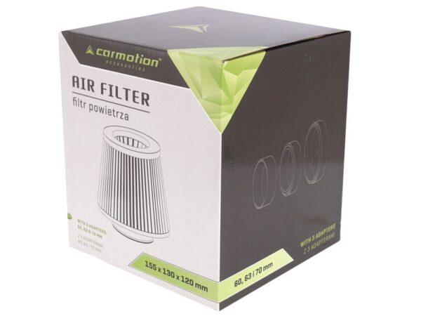 Conical air filter, dimensions 120x130x90 mm, made of cotton, covered with stainless steel mesh. Thanks to additional adapters, the filter can be adapted to most cars.