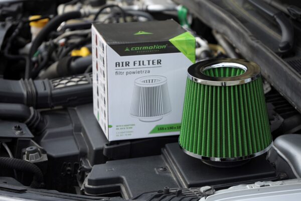 Oro filtras automobiliui, conical 155x130x120 mm, lime green / chrome, adapters: 60, 63, 70 mm
