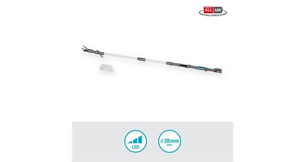 Ištiesus teleskopinį veleną, akumuliatorinis teleskopinis genėtuvas HighCut 250/18V yra 2,5 metro ilgio, kad būtų patogu dirbti nuo žemės iki 4 metrų aukštyje. Dėl teleskopinės funkcijos ir nuimamo koto genėtuvas gali būti naudojamas lanksčiai. POWER FOR ALL akumuliatoriaus papildomai suteikiama jėga leidžia lengvai pjauti šakas.