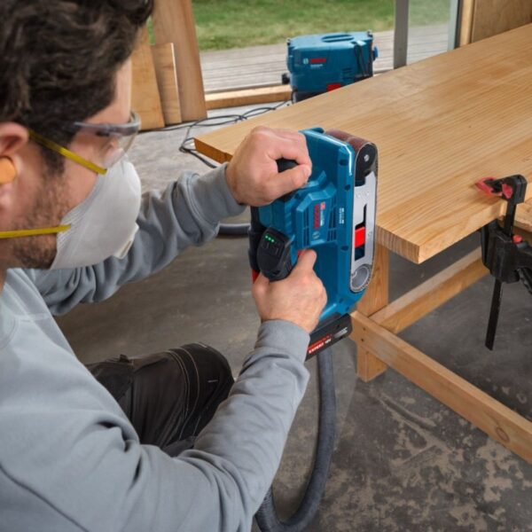- Kompaktiškas ir galingas akumuliatorinis juostinis šlifuoklis, skirtas medienos šlifavimui