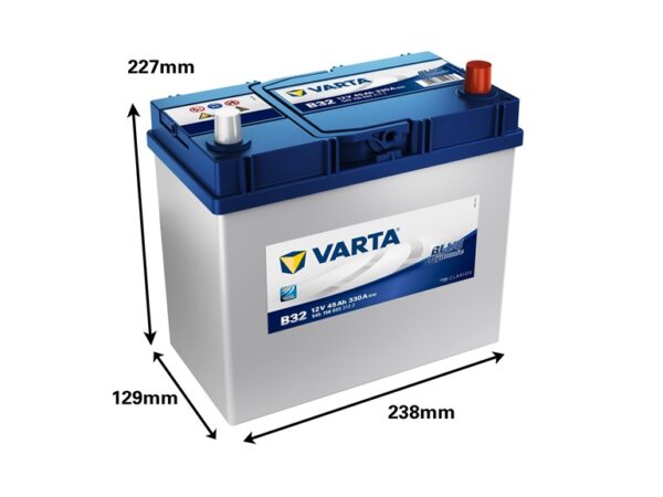 Prekės ženklas- Varta. Modelis- BD B32. Akumuliatoriaus tipas- Švino rūgštinis. Akumuliatorius skirtas- Automobiliams. Įtampa- 12 V. Akumuliatoriaus talpa- 45 Ah. Startinės srovės galingumas- 330 A. Poliškumas- – + . Ilgis- 23.8 cm. Plotis- 12.9 cm. Aukštis- 22.7 cm. Svoris- 11.43 kg. Garantija- 24 mėn. Papildoma informacija- Blue Dynamic.