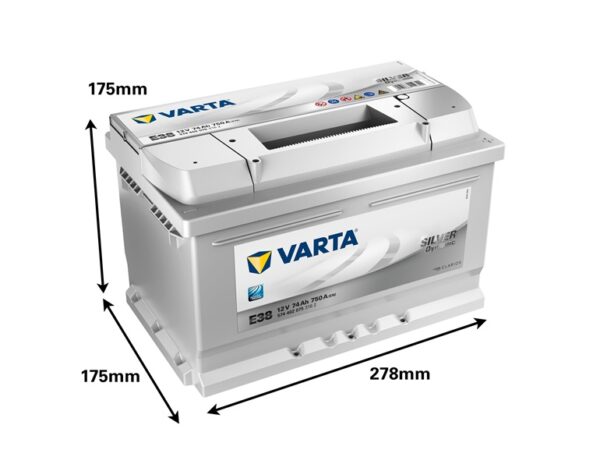 Prekės ženklas- Varta. Modelis- SD E38. Akumuliatoriaus tipas- Švino rūgštinis. Akumuliatorius skirtas- Automobiliams. Įtampa- 12 V. Akumuliatoriaus talpa- 74 Ah. Startinės srovės galingumas- 750 A. Poliškumas- – + . Ilgis- 27.8 cm. Plotis- 17.5 cm. Aukštis- 17.5 cm. Svoris- 16.7 kg. Garantija- 24 mėn. Papildoma informacija- Silver Dynamic.