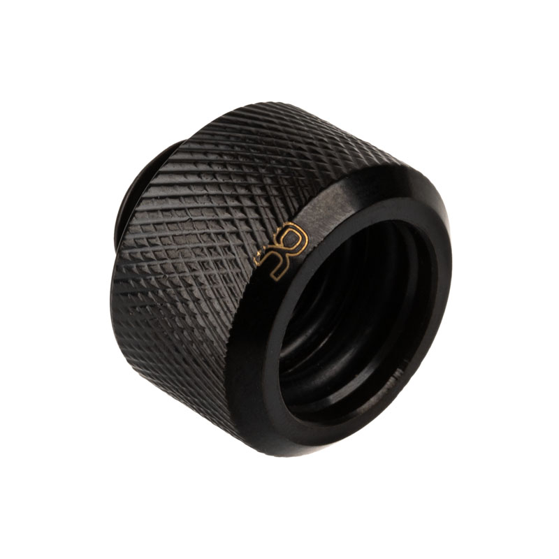Black hard tube fitting from Alphacool from the Eiszapfen series, with G1/4 inch thread for tubes with 16 mm OD, made entirely of brass, knurled nut
