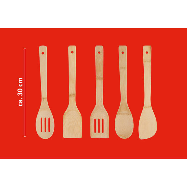 Set of 5 kitchen utensils with container, made of wood. The set includes: tongs, spatula, mixing spoon, straining spoon, pasta spoon and storage container.