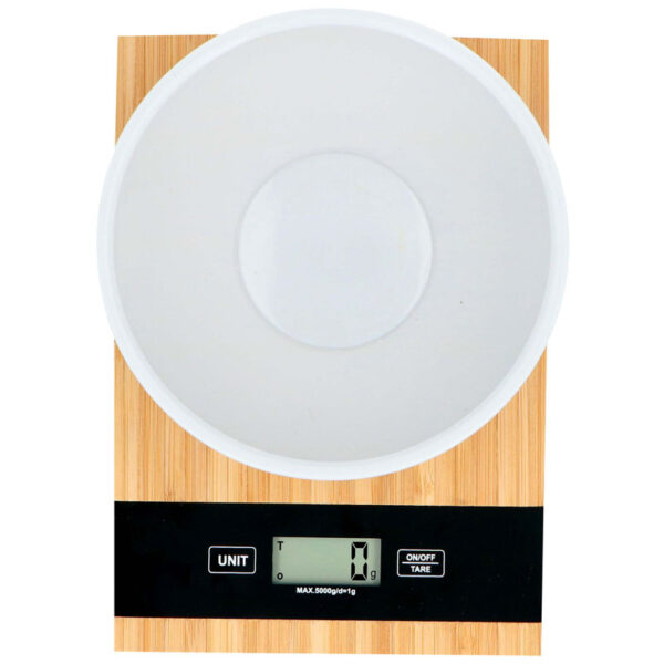 This digital kitchen scale with 100% eco-friendly bamboo weighing surface is a gem on your kitchen counter. It weighs extremely precisely to the gram. You can weigh products up to 5 kilograms on it and choose whether you want to do so in grams, pounds (lb), ounces (oz) or millilitres (ml).