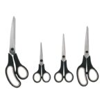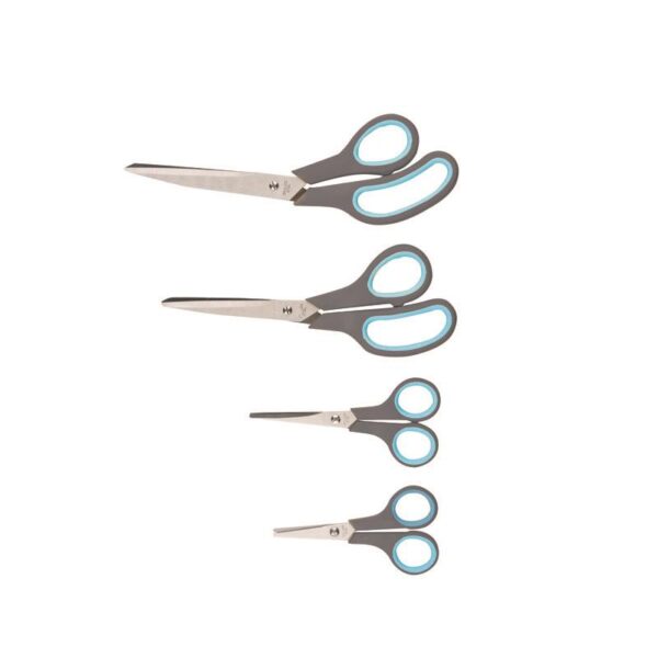 A set of four scissors comprising: tailor scissors (25 cm), household scissors (21 cm), fabric scissors (14 cm) and craft scissors (12 cm). Each of the scissors has an adjustable screw and ergonomically shaped, non-slip handles with soft inserts for high comfort during use. The stainless steel blades ensure easy cutting of paper, plastic, photos, cardboard, leather, fabric and more.