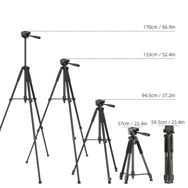 - You can adjust the height of the camera to each photographic task. The tripod is easily adjustable from 57 cm to 170 cm in height, making it suitable for a variety of shooting situations and styles.