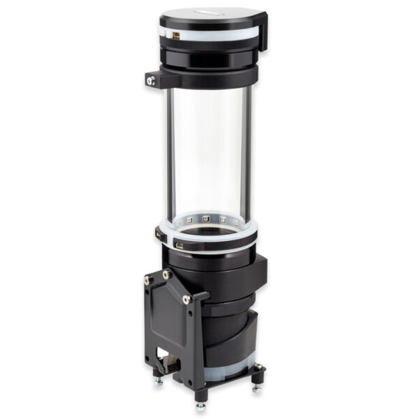 A aqua computer D5 NEXT Pump is mounted directly at the bottom of the reservoir. The pump features an OLED display and numerous control and adjustment functions. The pump is mounted via an aluminium ring at the bottom of the reservoir.