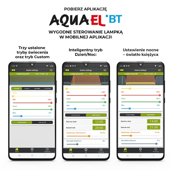LEDDY SMART BT NAUJAS ŠVIESOS VEIDAS Leddy Smart BT yra nauja mūsų minimalistinio LED lemputės versija. Jis skirtas mažiems akvariumo bakams nuo 10 iki 50 litrų talpos. Visas jo funkcijas galite valdyti mobiliojoje programėlėje per telefoną ar planšetinį kompiuterį. Nauja WRGB LED konfigūracija. Akvariumas yra ne tik žuvų, krevečių ir augalų namai, bet ir unikali kambario puošmena. Todėl šiuolaikiniai akvariumo priedai atlieka ne tik specifines funkcijas. Jie taip pat turėtų pasižymėti elegancija ir stilistiniu derėjimu su modernių kambarių interjeru. Be to, svarbus yra valdymo patogumas, pavyzdžiui, mobiliuoju telefonu. Visos šios funkcijos yra sujungtos mūsų naujajame LEDDY SMART BT akvariumo šviesoje. Jis garantuoja optimalias sąlygas bet kokio nano akvariumo priežiūrai ir tuo pačiu yra vizualiai lengvas dėl minimalistinio dizaino. Minimalistinis šviestuvas LEDDY SMART BT pasižymi gerai apgalvotu dizainu. Minimalistinį charakterį pabrėžia jo forma, kurioje nėra jokių nereikalingų ornamentų. Šviesos diodai paslėpti maksimaliai plokščiame korpuse (tik 1 cm). Tuo pačiu metu apšvietimo modulis yra pakankamai platus, kad lengvai apšviestų vandens paviršių akvariume. Lempa tinka mažiems bakams, kurių talpa nuo 10 iki 50 litrų, o aukštis ne didesnis kaip 35 cm. Leddy Smart BT lempos šviesos diodai yra pakankamai galingi, kad apšviestų jūsų baką. Lempa prisitvirtina tiesiogine prasme vienu judesiu – tiesiog perbraukite per bako kraštą. Specialūs skirtukai tvirtai laikys stovą vietoje. Nereikia jaudintis, kad lempa atsikabins ir įkris į vandenį. Saugus naudojimas šalia vandens Labai rūpinamės visų mūsų akvariumo šviestuvų saugumu. Leddy Smart BT turi visus reikalingus sertifikatus darbui prie vandens. Jis sandarus pagal IP67 klasę. Ši vandeniui atspari klasė reiškia, kad lempa yra visiškai apsaugota nuo dulkių patekimo ir nuo trumpo panardinimo į vandenį poveikio. Tai yra, jokia pavojinga situacija neatsiras, jei lempa bus aptaškyta arba netyčia įkris į akvariumą. Sureguliuokite šviesos spalvą pagal savo poreikius Pirmą kartą paėmę jį į rankas, galite savęs paklausti – kur paslėptas jungiklis? Mes jus nustebinsime – norint valdyti lempą tereikia mobiliojo telefono! Atsisiuntę Aquael BT programėlę gausite prieigą prie viso šios lempos valdymo pulto. Patogu, tiesa? Galite atsisėsti ant kėdės ir, laikydami telefoną rankoje, valdyti šviesos spalvos ir intensyvumo pokyčius bei nustatyti dienos ir nakties režimus. Skamba sudėtingai? Iš mūsų mokymo programos sužinosite, kaip intuityviai ir paprastai valdyti įrenginius BT režimu. Valdykite lempą naudodami išmaniojo telefono ir planšetinio kompiuterio programas Galite nuotoliniu būdu valdyti akvariumo apšvietimą naudodami „Aquael BT“ programą, skirtą „Android“ arba „IOS“. Tai leidžia susisiekti su lempa per mobiliuosius įrenginius, tokius kaip išmanusis telefonas ar planšetinis kompiuteris, naudojant Bluetooth technologiją. Programėlė leidžia nuotoliniu būdu reguliuoti apšvietimo parametrus – tokius kaip intensyvumas, spalvos temperatūra ar apšvietimo laikas – pagal individualius rezervuaro reikalavimus. Su jo pagalba taip pat galima valdyti kelias lempas ir dalytis prieiga kitiems žmonėms. Aquael BT galima apsaugoti PIN kodu. Lempa turi keturių spalvų šviesos diodus (WRGB): Balta (balta) Raudona (raudona) Žalia (žalia; nauja!) Mėlyna (mėlyna) Šviestuvas aprūpintas fiksuotais šviesos režimais, kuriuos nustatė „Aquael“ komanda. Kokie fiksuoti režimai jums galimi? Augalas – suteikia augalams idealų šviesos mišinį; pridėjus žalią šviesą, nuostabiai paryškina augalų spalvą; Šviesos diodai skleidžia šviesą, kurios spalvos temperatūra yra 9000 K Saulėta – stipri, vienoda dienos šviesa, kaip ir saulėtu oru; šviesos diodai skleidžia šviesą, kurios spalvos temperatūra yra 7000 K Marine – įdomus režimas, suteikiantis baltos ir mėlynos spalvos mišinį; spalvos temperatūra yra 10 000 K Be iš anksto nustatytų stilių, jūs taip pat turite galimybę patys laisvai nustatyti parametrus. Įjunkite pasirinktinį režimą ir pasirinkite spalvų derinį, kuris geriausiai atitinka jūsų pageidavimus ir tam tikro bako poreikius. Čia galite laisvai reguliuoti šviesos srautą, o tai ypač svarbu, jei akvariumas stovės miegamajame ar vaiko kambaryje. Dienos ir nakties režimas – pagal natūralų gamtos ritmą Mūsų sprendimai suteikia jums dar daugiau. Naudodami parinktį Day&Night nustatysite saulėtekio ir saulėlydžio akimirką savo akvariume! Tai gražiai išryškins akvariumo išdėstymą tiek dieną, tiek naktį, o patalpos, kurioje yra bakas, interjeras taps jaukesnis. Tereikia šiek tiek skirti laiko ir nustatyti laiką, kada įsijungs šviesa, taip pat laiką, kada lempa automatiškai užges. Šis metodas rūpinasi gyvūnų gerove, kurių stresas yra kuo mažesnis, o gyvenimo sąlygos kuo artimesnės natūraliam paros ciklui. Taip pat galite nustatyti, kad apšvietimas palaipsniui šviestų arba pritemdytų per ilgesnį intervalą, maks. 60 minučių. Nakties šviesos režimas Nustatydami Mėnulio apšvietimą reguliuosite mėnulio šviesos galią. Toks režimas leidžia stebėti povandeninį pasaulį net ir sutemus. Tai taip pat geras pasirinkimas žiūrėti į žuvis ir naktinio gyvenimo būdo gyvūnus. Tuo pačiu metu tokia šviesa jokiu būdu neturi įtakos gyvų organizmų funkcionavimui ir yra visiškai saugi jiems – taip pat ir jums, jei akvariumą statysite miegamajame. Leddy Smart BT šviestuvų modeliai Leddy Smart BT linijos apšvietimas yra būtinas norint apšviesti krevečių ir kitas mažas talpyklas. Jo papildomas privalumas yra nereikalaujantis priežiūros ir ilgaamžiškumo – sumontuoti šviesos diodai gali dirbti iki 15 tūkst. Tai reiškia retesnius keitimus ir ilgesnį įrangos veikimą. Tai taip pat labai mažai 