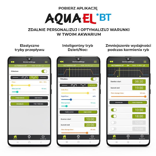 - Nuotolinis valdymas: Maitinimo ir srauto nustatymai per „Aquael BT“ programėlę išmaniajame telefone arba planšetiniame kompiuteryje.