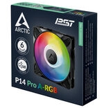The ARCTIC P14 Pro A-RGB PWM is a powerful 140mm case fan with addressable RGB lighting, offering visually appealing yet efficient cooling solutions. With its high static pressure, it is ideal for use on radiators or behind airtight case fronts. The integrated ARGB lighting can be conveniently controlled via common motherboard systems.
