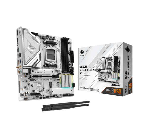 The ASROCK B850M Steel Legend Wifi is a Micro-ATX motherboard featuring the mid-range AMD B850 chipset and the AMD AM5 socket. It supports Ryzen 9000, 8000, and 7000 CPUs.