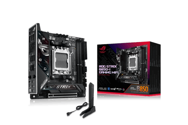The ASUS ROG STRIX B850-I Gaming WiFi is a Mini-ITX motherboard featuring the mid-range AMD B850 chipset and the AMD AM5 socket. It supports both Ryzen 9000, 8000, and 7000 CPUs.