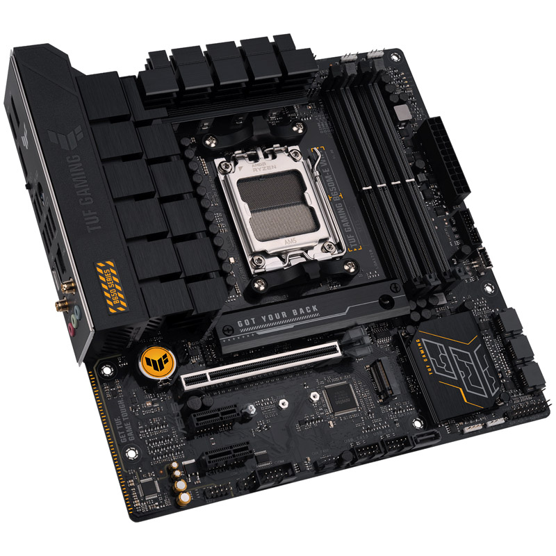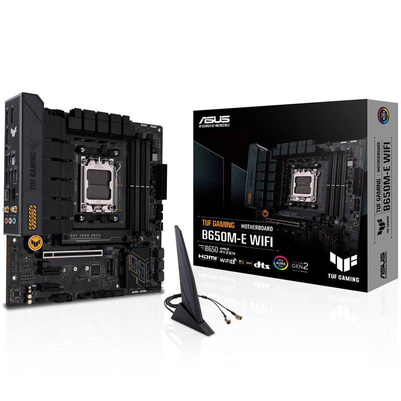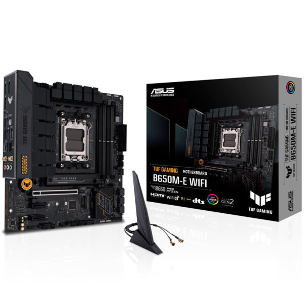 ASUS TUF GAMING B650M-E WIFI takes all the essential elements of the latest AMD Ryzen 7000-series processors and combines them with game-ready features and proven durability. Engineered with military-grade components, an upgraded power solution and a comprehensive cooling system, this motherboard goes beyond expectations with rock-solid and stable performance for marathon gaming. TUF GAMING motherboards also undergo rigorous endurance testing to ensure that they can handle conditions where others may fail. Aesthetically, this model incorporates rugged off-black and geometric design elements to reflect the dependability and stability that defines the TUF GAMING series.