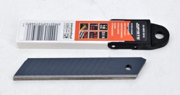 Atsarginių nulaužiamų peiliukų rinkinys Jufisto. Techniniai duomenys: – kiekis pakuotėje: 10 vnt. – peiliuko storis: 0,5 mm – peiliuko plotis: 18 mm – plienas: SK4