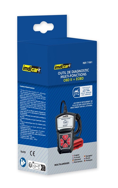Prekės ženklas- Imdicar. Modelis- 71901. Papildoma informacija- Imdicar OBD2 diagnostikos įrankis palaiko visus OBDII protokolus bandymo režimų visose transporto priemonėse.Atitinka OBD II reikalavimus: benzininiai automobiliai nuo 2000 m. ir dyzeliniai nuo 2003 m. Su hibridinėmis ir elektrinėmis transporto priemonėmis nėra suderinama..