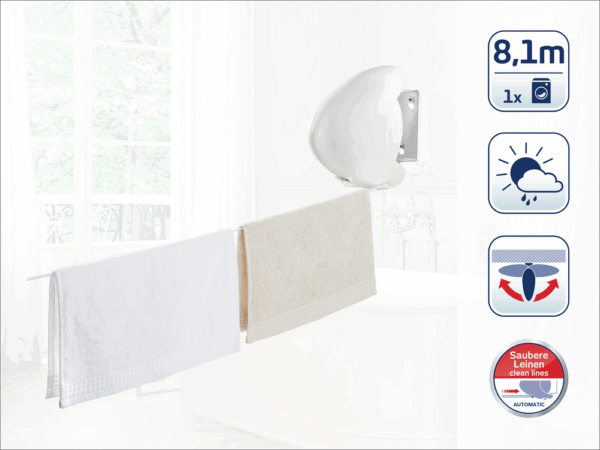 Kompaktiškas, praktiškas ir patogus – būtent tai yra „LEIFHEIT Rollfix Single 80 Longline“ sienų džiovintuvas. Taupo vietą kambaryje. Kai skalbiniams džiovinti nereikia virvės, patraukite ją į laikymo stalčių. Taip skalbinių virvė bus švari ir be dulkių, kai ji nenaudojama. Sieninis džiovintuvas „LEIFHEIT Rollfix Single 80 Longline“ yra su automatiniu virvės įtempikliu. Visiškai ištraukę virvę, galite išdžiovinti maždaug vienos skalbimo mašinos turinį. Šią virvę galite naudoti tiek viduje, tiek lauke, nes virvė pagaminta iš atmosferos poveikiui atsparios medžiagos.