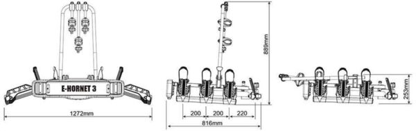 Prekės ženklas- BuzzRack. Modelis- E-Hornet 3. Tvirtinimo būdas- Ant kablio. Maksimalus dviračių skaičius- 3. Maksimalus dviračio svoris- 15 kg. Galima sulankstyti- Taip. Ilgis- 127.2 cm. Plotis- 25.3 cm. Dviratis rakinamas prie laikiklio- Ne. Svoris- 22 kg.