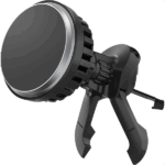 Car phone holder, mechanically locked. Arms with damping tightened by a gear. Adjustable connecting arm. Mechanism allowing horizontal and vertical rotation. The holder supports devices with a screen size from 4.7 to 7.2 inches. Mounted using a vacuum suction cup.