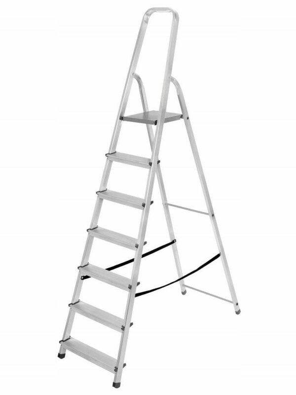 Lengvos ir tvirtos konstrukcijos aliumininės kopėčios. Neslystantys, rifliuoti laipteliai tvirtai pritvirtinti prie šoninių profilių, užtikrinant didesnį stabilumą. Laiptelių galai apsaugoti plastikiniais antgaliais (spalvos gali skirtis). Plati darbinė platforma. Aukštas 60 cm turėklas apsaugo nuo kritimo. Turi nailoninius diržus, apsaugančius nuo savaiminio išsiskėtimo. Profiliuotos neslystančios kojelės užtikrina gerą sukibimą su paviršiumi. Lengvai sulankstomos patogiam transportavimui ir sandėliavimui. Lenkiškas gaminys. Techniniai duomenys: Laiptelių skaičius: 1×8 Platformos matmenys: 25 x 26 cm Maks. apkrova: 125 kg Maks. kopėčių aukštis: 237 cm Darbinis aukštis / iki platformos: 162 cm Svoris: 5,600 kg