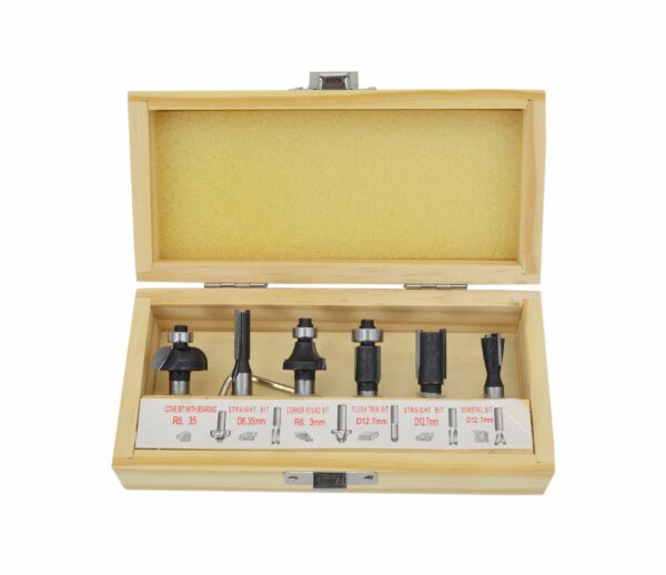 Kietmetalio ašmenys su grūdinto plieno kotu. Skirti medžio drožlių plokščių, MDF plokščių, kietosios ir minkštosios medienos pjovimui, apipjaustymui, griovelių darymui ir profiliavimui. Trys frezos turi guolius. Rinkinyje yra raktas guolių keitimui. Kiekviena freza pažymėta lengvam atpažinimui. Cilindrinis kotas suderinamas su viršutinėmis frezavimo staklėmis ir gręžtuvais. Viskas supakuota medinėje dėžutėje. Techniniai duomenys: Kiekis: 6 vnt. Kotas: 8 mm Svoris: 300 g
