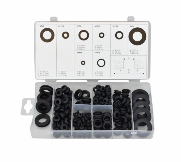 Pagaminta iš aukštos kokybės guminės medžiagos. Atspari cheminėms medžiagoms ir aukštai temperatūrai. Skirta apsaugoti kabelius ir laidus nuo aštrių briaunų ar aštrių detalių. Viskas supakuota į rūšiavimo dėžutę su skyreliais. Dydžiai nurodyti vidinėje dangtelio pusėje greitam atpažinimui. Idealiai tinka naudoti namuose, dirbtuvėse ir servise. Techniniai duomenys: Kiekis: 180 vnt. Svoris: 240 g