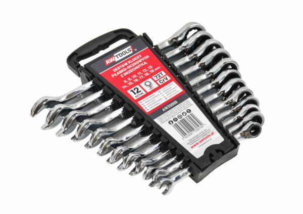 AWTOOLS PLOKŠČIAS-ŽIEDINIS RAKTŲ RINKINYS SU REKETU 12vnt 8-19mm SU PERJUNGIKLIU
