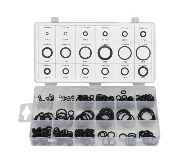 Pagaminta iš aukštos kokybės guminės medžiagos. Atspari cheminėms medžiagoms ir aukštai temperatūrai. Skirta sandariam vamzdžių bei kitų hidraulinių ir pneumatinių sistemų elementų sujungimui. Viskas supakuota į rūšiavimo dėžutę su skyreliais. Dydžiai nurodyti vidinėje dangčio pusėje greitam atpažinimui. Idealiai tinka naudojimui namuose, dirbtuvėse ir servisuose. Techniniai duomenys: Kiekis: 225 vnt. Dydis: 20x 3x1mm; 20x 4x1mm; 20x 4.5x2mm; 20x 5x2mm; 20x 6x2mm; 20x 6×2.5mm; 5x 13x3mm; 5x 14×2.5mm; 5x 17×2.5mm; 5x 18x4mm; 5x 20x2mm; 5x 22x2mm; 20x 6x3mm; 20x 7x2mm; 20x 8x2mm; 5x 9x2mm; 5x 10x2mm; 5x 12x3mm Svoris: 140 g