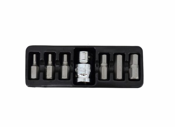 Pagaminta iš grūdinto S2 legiruotojo plieno, atsparaus deformacijoms. Skirta specialių šešiakampių (HEX) varžtų atsukimui. Idealiai tinka automobilių dirbtuvėms, padangų montavimo servisams ir techninės priežiūros centrams. Viskas supakuota plastikinėje dėžutėje. Rinkinį sudaro: Kiekis: 7 vnt. 6x HEX antgaliai: 4; 5; 6; 8, 10; 12 mm 1x adapteris 1/2″ Svoris: 175 g