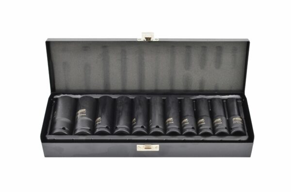 Pagaminta iš grūdinto ir sukietinto CrMo plieno, oksiduota apdaila. Suapvalintas kampų profilis leidžia atsukti pažeistus varžtus ir apsaugo varžto galvutės formą nuo deformacijos. Turi angą fiksavimo kaiščiui ir griovelį sandarinimo žiedui. Lazeriu pažymėtas dydis lengvam atpažinimui. Ilga galvutės konstrukcija leidžia pasiekti sunkiai prieinamas vietas. Puikiai tinka šešiakampių varžtų ir veržlių atsukimui. Skirta darbui su pneumatiniais, elektriniais ir akumuliatoriniais smūginiais veržliasukiais. Idealiai tinka įvairioms reikmėms, įskaitant automobilių remontą, mašinų priežiūrą ir bendrus mechaninius darbus. Viskas supakuota metalinėje kasetėje. Techniniai duomenys: Tvirtinimas: 1/2″ Ilgis: 78 mm Dydžiai: 10; 12; 13; 14; 15; 16; 17; 19; 22; 24 mm Kiekis: 11 vnt. Svoris: 2,5 kg