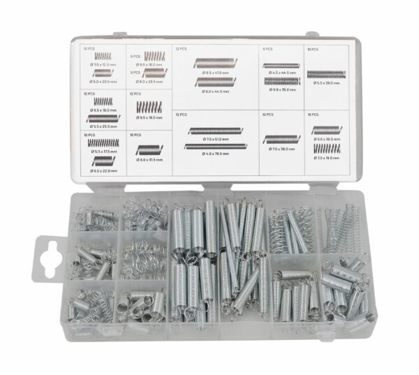 Pagaminta iš aukštos kokybės spyruoklinio plieno, cinkuota. Pasižymi dideliu kietumu, atsparumu rūdims ir korozijai, todėl yra patvarios naudojant. Viskas supakuota į rūšiavimo dėžutę su skyreliais. Etiketė su dydžių lentele vidinėje dangčio pusėje skirta greitam identifikavimui. Idealiai tinka naudoti namuose, dirbtuvėse ir servisuose. Techniniai duomenys: Kiekis: 200 vnt. Slėgimo spyruoklės: 74 vnt. Tempimo spyruoklės: 124 vnt. Svoris: 350 g