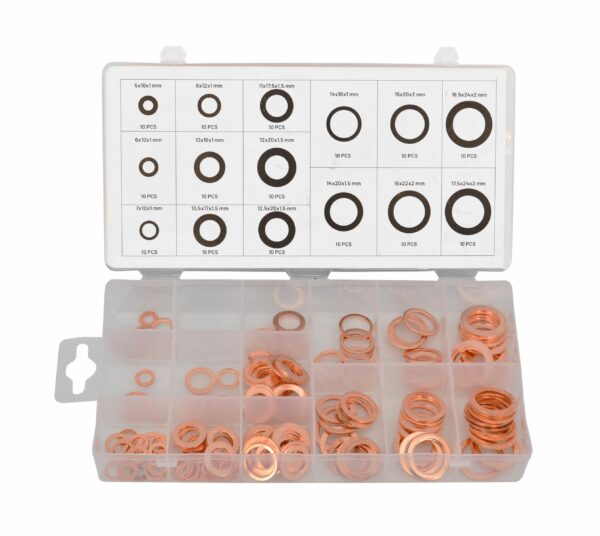 Pagaminta iš aukštos kokybės vario medžiagos. Pasižymi geru elektriniu ir šiluminiu laidumu. Apsaugo tvirtinimo elementus nuo atsilaisvinimo, gali būti naudojamos kaip tarpikliai, poveržlės, išankstinio įtempimo elementai, fiksavimo įtaisai bei vibracijos mažinimui. Viskas supakuota patogioje dėžutėje su skyreliais. Dydžiai nurodyti vidinėje dangtelio pusėje greitam atpažinimui. Idealiai tinka naudojimui namuose, dirbtuvėse ir servisuose. Techniniai duomenys: Kiekis: 150 vnt. Dydžiai: 10 vnt: 5x10x1; 10 vnt: 8x11x1; 10 vnt: 11x17x1,5; 10 vnt: 12,5x20x1,5; 10 vnt: 15x20x2; 10 vnt: 16,5x24x2; 10 vnt: 6x10x1; 10 vnt: 10x16x1; 10 vnt: 14x18x1; 10 vnt: 7x10x1; 10 vnt: 10,5x17x1,5; 10 vnt: 12x20x1,5; 10 vnt: 14x20x1,5; 10 vnt: 16x22x2; 10 vnt: 17,5x24x2 Svoris: 300 g