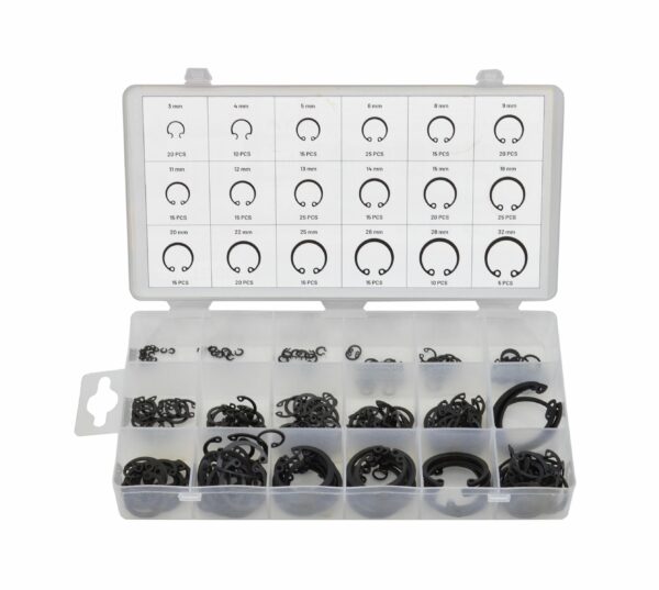Pagaminta iš aukštos kokybės spyruoklinio plieno. Oksiduota apdaila, atspari rūdims ir korozijai. Skirta stūmoklio kaiščiams ir pavaros veleno lankstų kaiščiams apsaugoti nuo išslydimo, užtikrinant puikų fiksavimą. Tinka kaip apsauginiai elementai guoliams, įvorėms, diskams, krumpliaračiams ir kitoms detalėms. Viskas supakuota į rūšiavimo dėžutę su skyreliais. Dydžiai nurodyti vidinėje dangčio pusėje greitam identifikavimui. Idealiai tinka naudojimui namuose, dirbtuvėse ir servisuose. Techniniai duomenys: Kiekis: 300 vnt. Dydis: 20x 3mm; 10x 4mm; 15x 5mm; 25x 6mm; 15x 8mm; 20x 9mm; 15x 11mm; 15x 12mm; 25x 13mm; 15x 14mm; 20x 15mm; 25x 19mm; 15x 20mm; 20x 22mm; 15x 25mm; 15x 26mm; 10x 28mm; 5x 32mm Svoris: 250 g