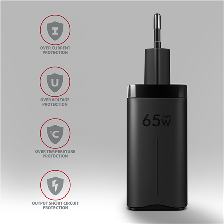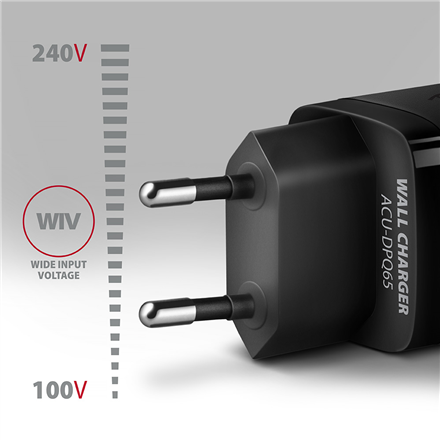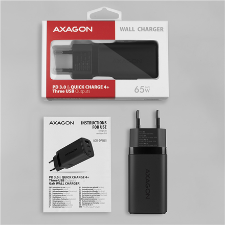 The AXAGON ACU-DPQ65 GaN travel wall charger enables fast charging of up to three mobile devices at the same time. With 65W of total power, the charger charges notebooks, phones and other mobile devices at the highest possible speed. The adapter offers a standard USB-A connector, but also two double-sided USB-C connectors.