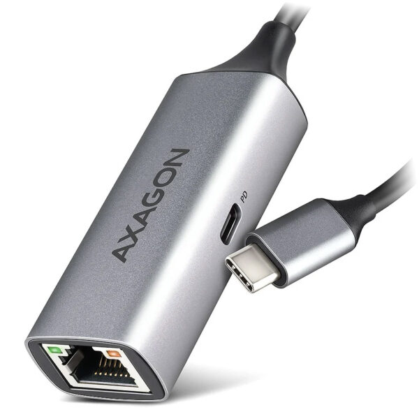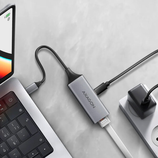 The external network card AXAGON ADE-TXPD with USB-C PD 100W connector easily converts the USB-C port to Gigabit Ethernet port. The adapter can add a missing RJ-45 network connector, add another network card, or replace the original non-functional network connection. A big advantage is the integrated Power Delivery connector, which allows you to connect a charger and thus provides the possibility of powering the laptop. Thanks to the 15 cm cable with USB-C connector, you can connect the Ethernet adapter to any computer, tablet or phone.