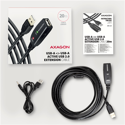 Active extension AXAGON ADR-220 USB 2.0 cable, 20 m long is ideal for connecting your computer to a USB device such as a mouse, keyboard, webcam, printer, scanner, plotter and others. The active USB repeater cable strengthens the passing signal and allows you to connect a significantly more distant USB device than the usual passive cable. The range of the cable can be further extended by using several cables in a row.
