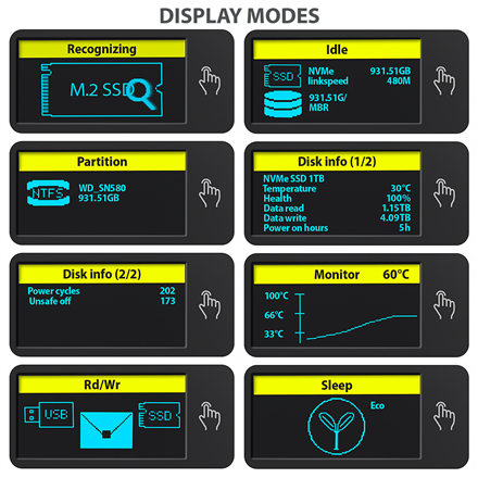 The box is equipped with an advanced LED display that provides an instant overview of your drive’s status. It offers several display modes, including detection of the connected drive, the file system used, temperature, drive health, data transfer speed, and operating hours. A detailed graph allows real-time monitoring of the drive’s temperature, while the sleep mode saves power when idle. With this intelligent monitoring, you will always have your drive under control – simply, clearly, and efficiently.