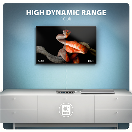 With the AXAGON HMC-7HX2 USB Hub, a single USB-C port can be transformed into seven different connectivity options. This includes two monitors, which can be operated via HDMI at up to 4K at 60 Hz, space for three additional USB devices (2x USB-A and 1x USB-C), a Gigabit LAN cable, and a charging port with up to 100W power delivery.