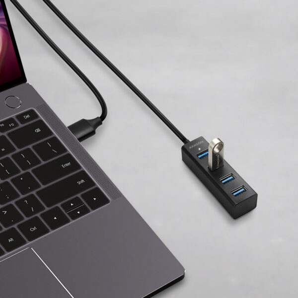 Miniature metal USB 3.2 Gen 1 (USB 3.0) hub AXAGON HUE-M1AL with 1.2 m long USB cable fast and easy connects up to four USB devices to computer.