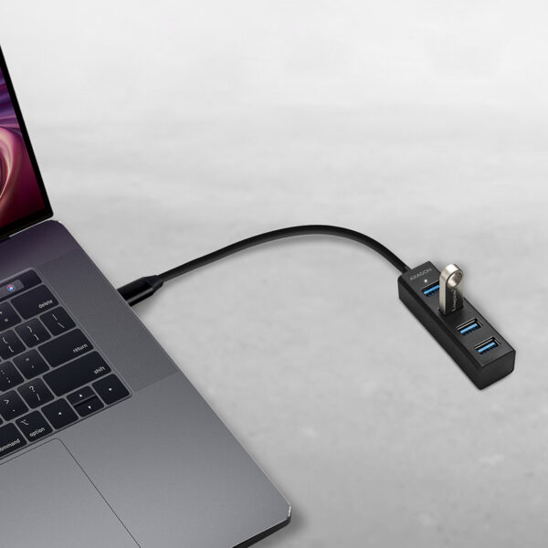 Miniature metal USB-C 3.2 Gen 1 hub AXAGON HUE-M1C fast and easy connects up to four USB devices to laptop or computer.