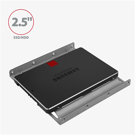 This simple adapter easily solve 2.5″ HDD or SSD disk mounting into standard computer case. The drive height is not limited, thus SSD and hard disk drives of any sizes can be used.
